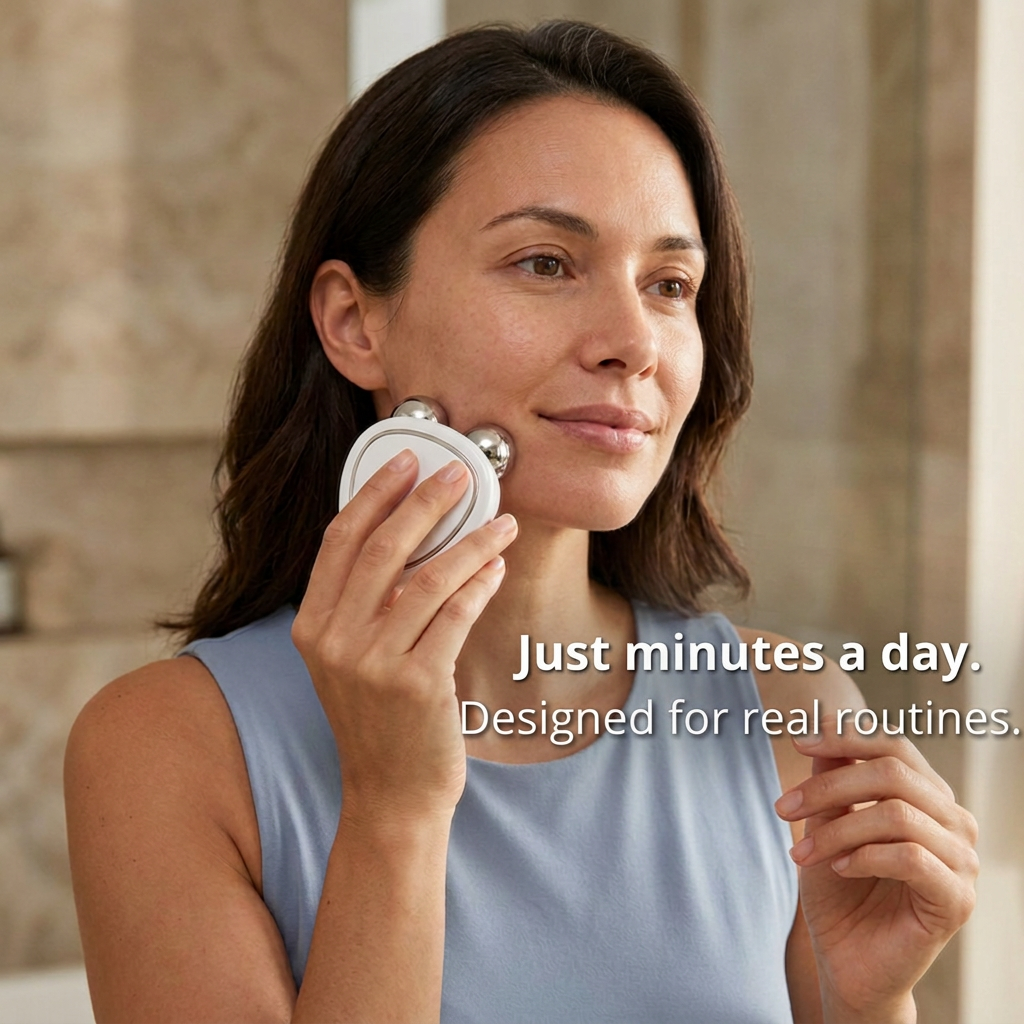 With consistent use, it supports a more lifted, defined look — especially around the jawline, cheeks, and neck.